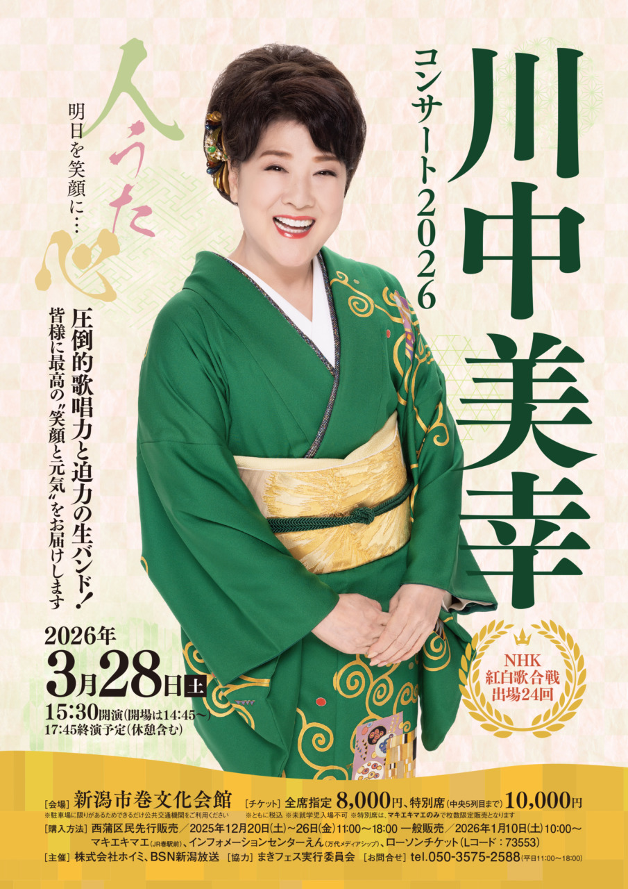 新潟・新潟市巻文化会館 (クリックで拡大)メディアコンサート会 場新潟市巻文化会館 新潟県新潟市西蒲区巻甲635番地 日 程2026年3月28日(土)時 間開演15:30 ※1回公演 価 格全席指定 8000円 特別席(中央5列目まで)10000円 発売日1月10日 お問い合わせ株式会社ホイミ TEL 050-3575-2588 (平日11:00~18:00 )