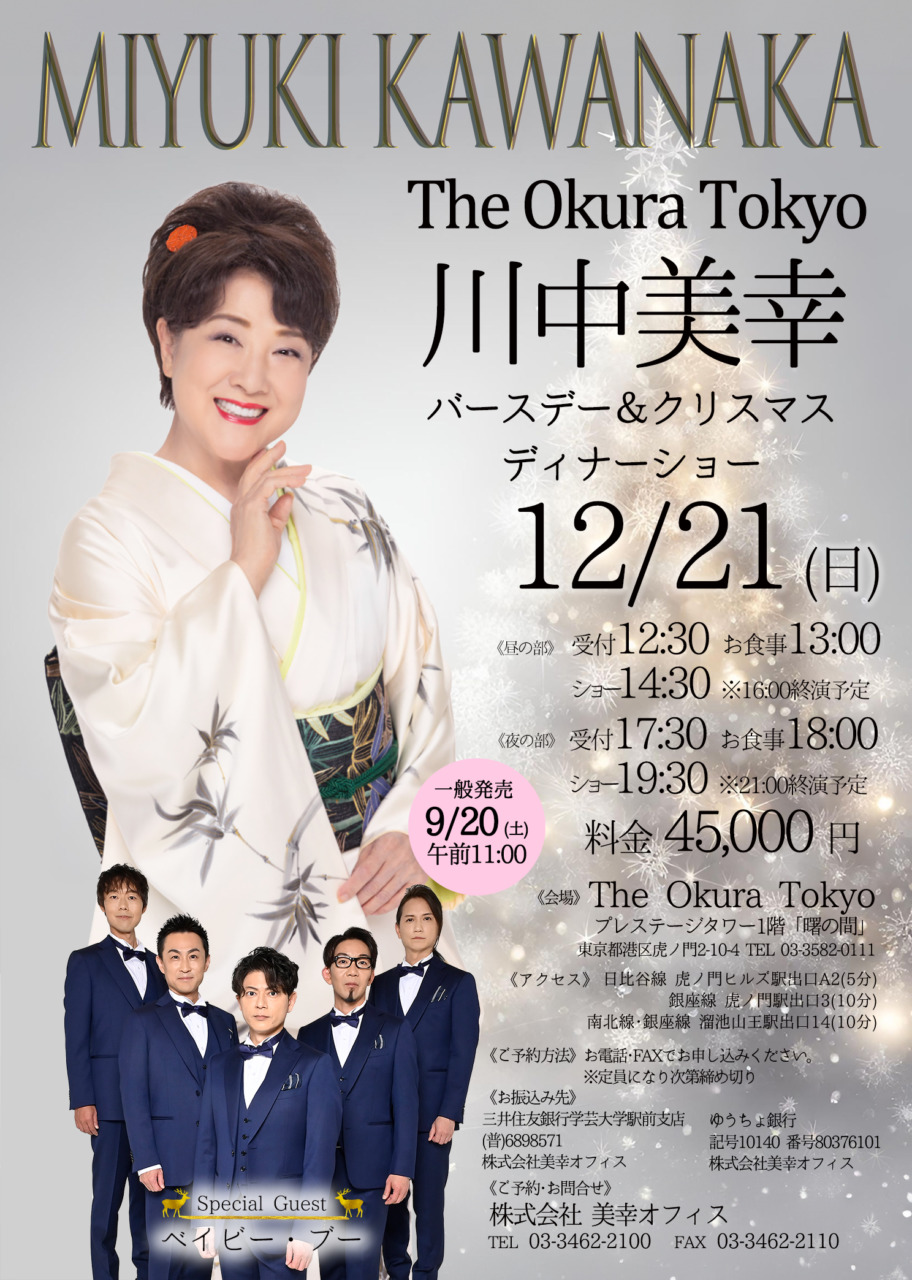東京・The Okura Tokyo 「バースデー&クリスマスディナーショー」 (クリックで拡大)メディアイベント会 場The Okura Tokyo 東京都港区虎ノ門2丁目10-4 日 程2025年12月21日(日)時 間昼 食事13:00 ショー14:30 夜 食事18:00 ショー19:30 価 格45000円 発売日9月20日 お問い合わせ株式会社美幸オフィス TEL 03-3462-2100